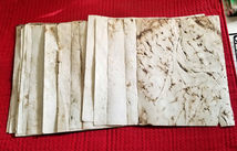 Paper has a blue/grey/purple tint; some pages have tea embedded in them